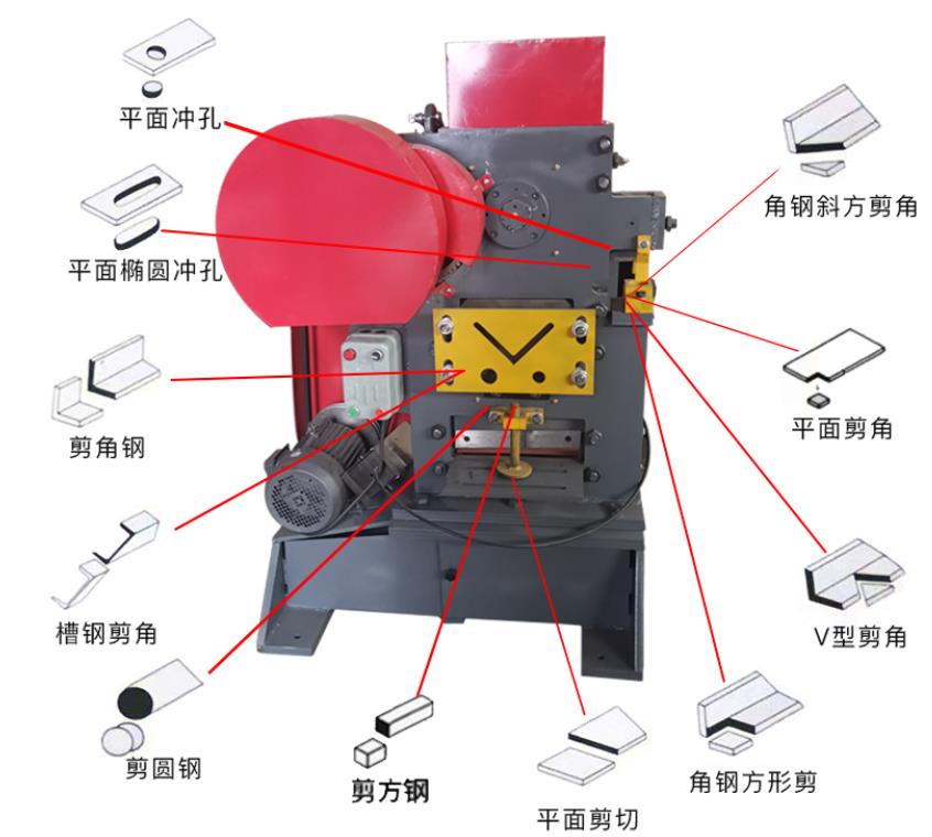 多功能冲剪机综合了冲孔,剪板角钢剪切,型材剪切等多种功能,具有重量轻、体积小、噪音低效率高等多重优点,是冶金、桥梁、通讯、电力等现代机械制造业的理想设备。